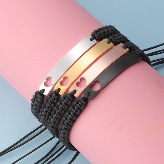 Bracelet en acier inoxydable gravable avec découpe en forme de cœur et corde en cire tressée (3 pièces)